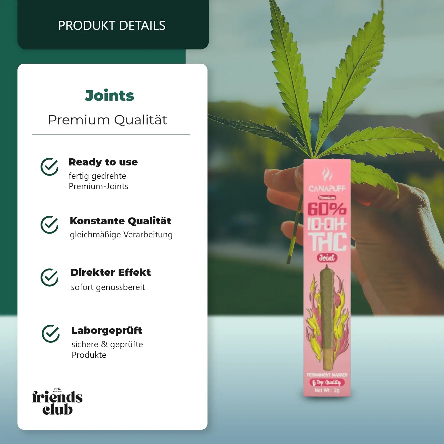 Odkryj niepowtarzalną intensywność Jointy Permanent Marker 60% 10-OH-THC. Ten 2g Joint wyróżnia się silnym kwiatowym zapachem, któremu towarzyszy nuta słodkich winogron. Odmiana ta nie bez powodu została wybrana „Odmianą roku 2023” – jej unikalny i intensywny aromat przypomina mocnego czarnego Sharpie.