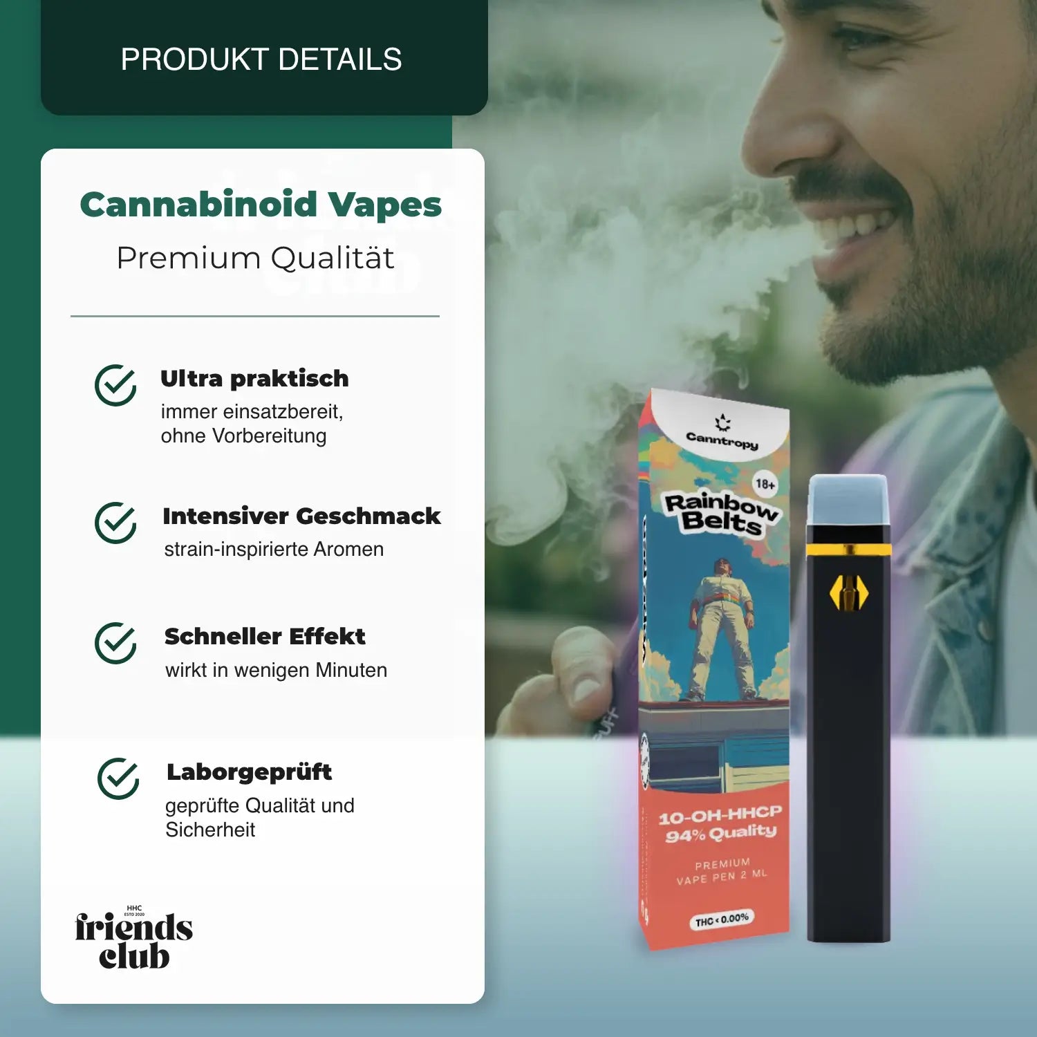 Îți dorești o experiență de vaporizare dulce și fructată? Atunci Rainbow Belts Vape Pen de la Canntropy este exact ceea ce cauți! Cu un 94 % conținut total, din care 5 % 10-OH-HHCP și 5 % terpene, te așteaptă un efect puternic, dar plăcut și blând - combinat cu gustul bomboanelor colorate de curcubeu.