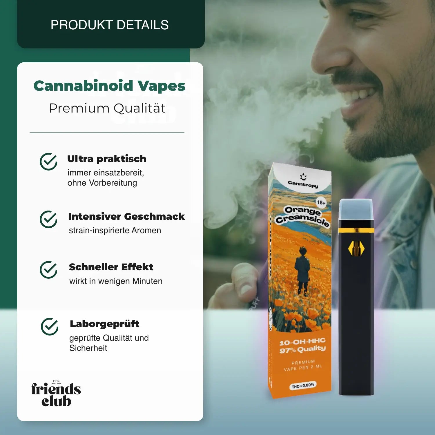 Bucură-te de gustul dulce-cremos de portocală și smântână cu 10-OH-HHC Vape Pen de la Canntropy. Cu 20 % 10-OH-HHC și 97 % conținut total de substanțe active, acest vape îți oferă o experiență puternică și plăcută - ideal pentru cei care preferă intensitatea, dar și delicatețea.
