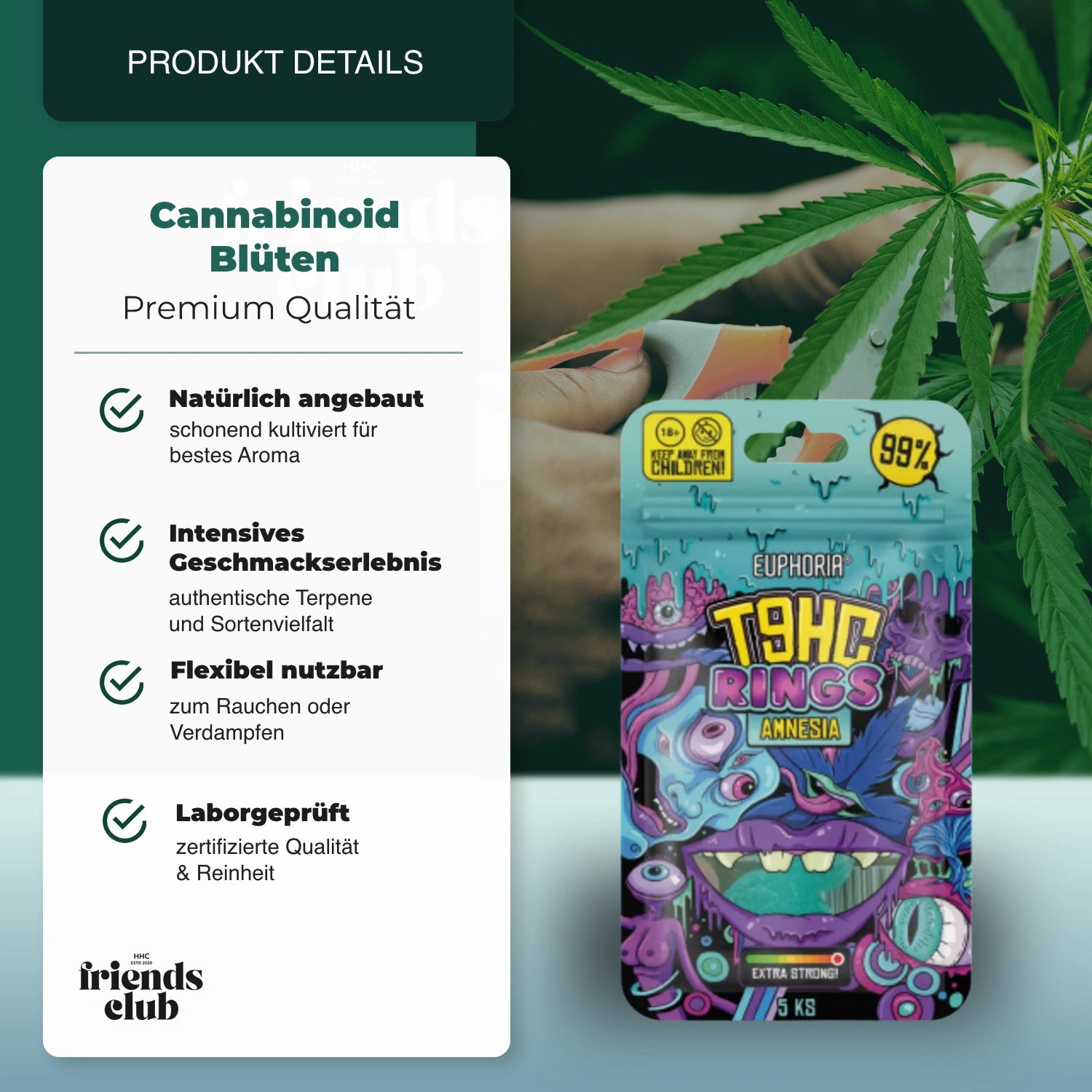 Deze aromatische ringen zien er niet alleen lekker uit – ze brengen ook een heerlijke geur in je leven. De gummibeertjes-ringen zijn voorzien van het moderne cannabinoïde T9HC, dat bekend staat om zijn sterke en toch heldere werking – geheel legaal.