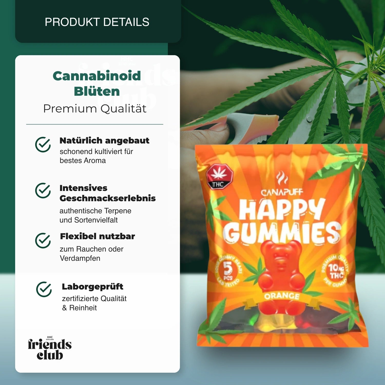 De THC Gummibeertjes van Canapuff bevatten minder dan 0,2% THC en zijn uitsluitend bedoeld voor aromatische, decoratieve en verzameldoeleinden. Dankzij de handige verpakking kun je ze overal mee naartoe nemen – of het nu naar de woonkamer is of op reis.